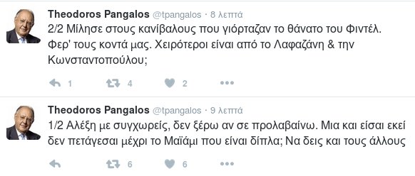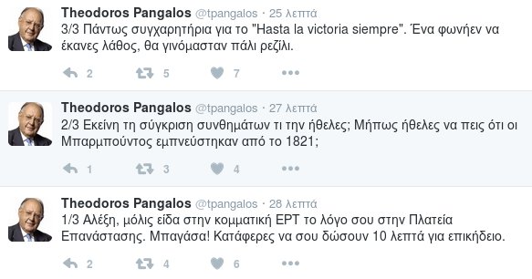 Λίγα λεπτά αργότερα ο κ. Πάγκαλος έγραψε πως είδε την ομιλία Τσίπρα «στην κομματική ΕΡΤ» και σχολίασε με τρία νέα tweets:
